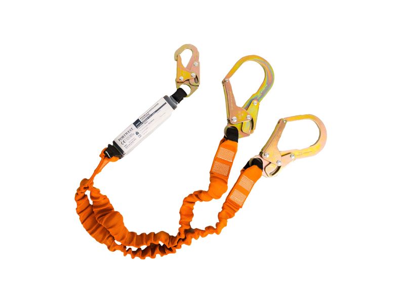 Kétszárú, energiaelnyelő kötélzet. Kapcsos horoggal, valamint a rugalmas szárvégeken akasztóhorgos karabinerekkel. A rugalmas hevederszalagok nem zavarnak munkavégzés közben. Az energiaelnyelő csökkenti az esés megállításakor a testre nehezedő erőhatásokat. 180 cm-es teljes hossz. 140 kg-os terhelhetőséggel.