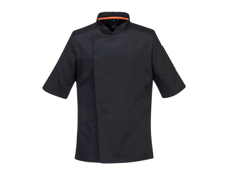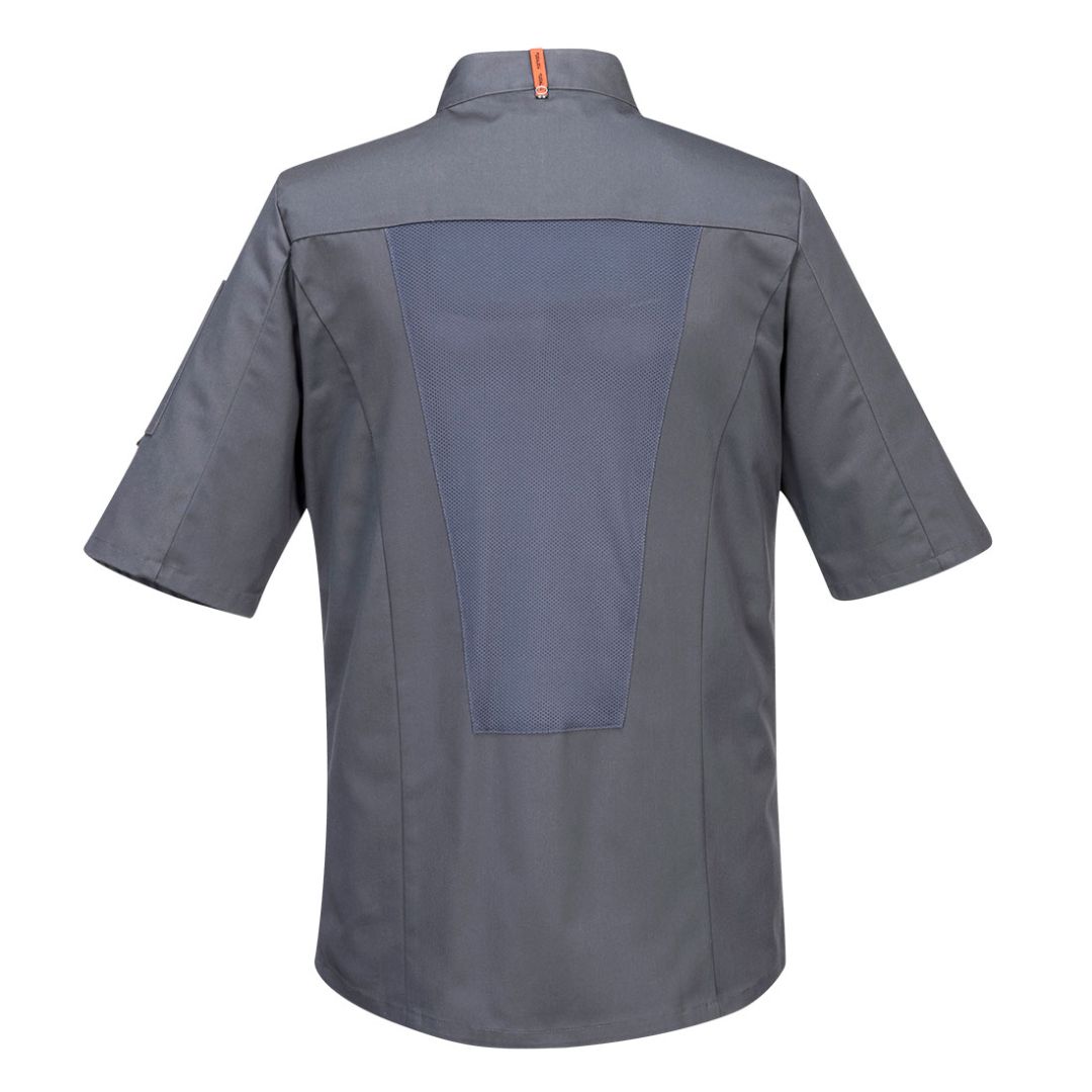 MeshAir panelekkel ellátott C738 ideális megoldás a forró konyhai környezetre. Dupla gombolású rejtett rögzítéssel és tollzsebbel. Stílusos és praktikus séf munkakabát. Rejtett patentos záródás Ujjzseb MeshAir™ szellőző hálós kialakítás Poliészter/Pamut Texpel szövet 1 zseb Mérettartó alapanyag Kötény akasztófül Slim fit