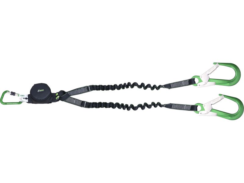 - 35 mm széles poliészter tágítható/elasztikus hevederzsinór, kifejezetten az éles szélek ellenállóképességére. - Energiaelnyelő 45 mm széles, szabályozott szakadású hevederben, amely 6 kN alá csökkenti az esés hatását. - Csatlakozók: 2 db zöld alumínium állványkampó, kapunyílás 60 mm és 1 db zöld alumínium csavarzáras karabiner, kapunyílás 18,5 mm. - A hurkokat kopásálló cső heveder védi. - Kompakt energiaelnyelő, kis cipzáras tasakkal védett, könnyen nyitható az energiaelnyelő heveder belső vezérléséhez. EN 355:2002