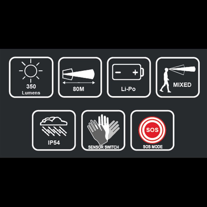 A kompakt, sokoldalú, könnyű és kényelmes Rainbow fejlámpa tökéletes világítási megoldást kínál, mely munkavégzés során is könnyen elérhető és bekapcsolható - Fényteljesítmény: 350 Lumen, nyalábtávolság: 80 m - Vízzáróság: IP54 - Akkumulátor típusa: Li-Po (tartozék) - Min./max. futási idő: 2h30 / 8h - Töltési idő: 2 óra 30 perc - Előnyök: Nagyon széles fénysugár (akár 230°-os sugárzási szög), érzékelő kapcsoló, SOS mód - Súly: 75 g.