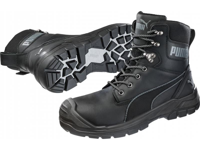 A Puma Safety munkavédelmi bakancsok Conquest Blk Ctx High S3 WR HRO SRC típusa üvegszálas orrmerevítővel, FAP hajlékony, kerámiaszálas talpátszúrás elleni védelemmel ellátott, magasított szárú védőbakancs, olajozott színbőr felsőrésszel. Belül lélegző bélés, beépített COA.TEX® membrán és Evercushion® BA+ talpbetét található. Extra felszereltséggel rendelkezik, mint például az YKK cipzáros záródás, zárt nyelvrész és TPU sarok megerősítés. Talpa PU/gumi, 300°C-ig hőálló és csúszásbiztos, akár sáros, egyenletlen talajra is kifejezetten ajánlott.