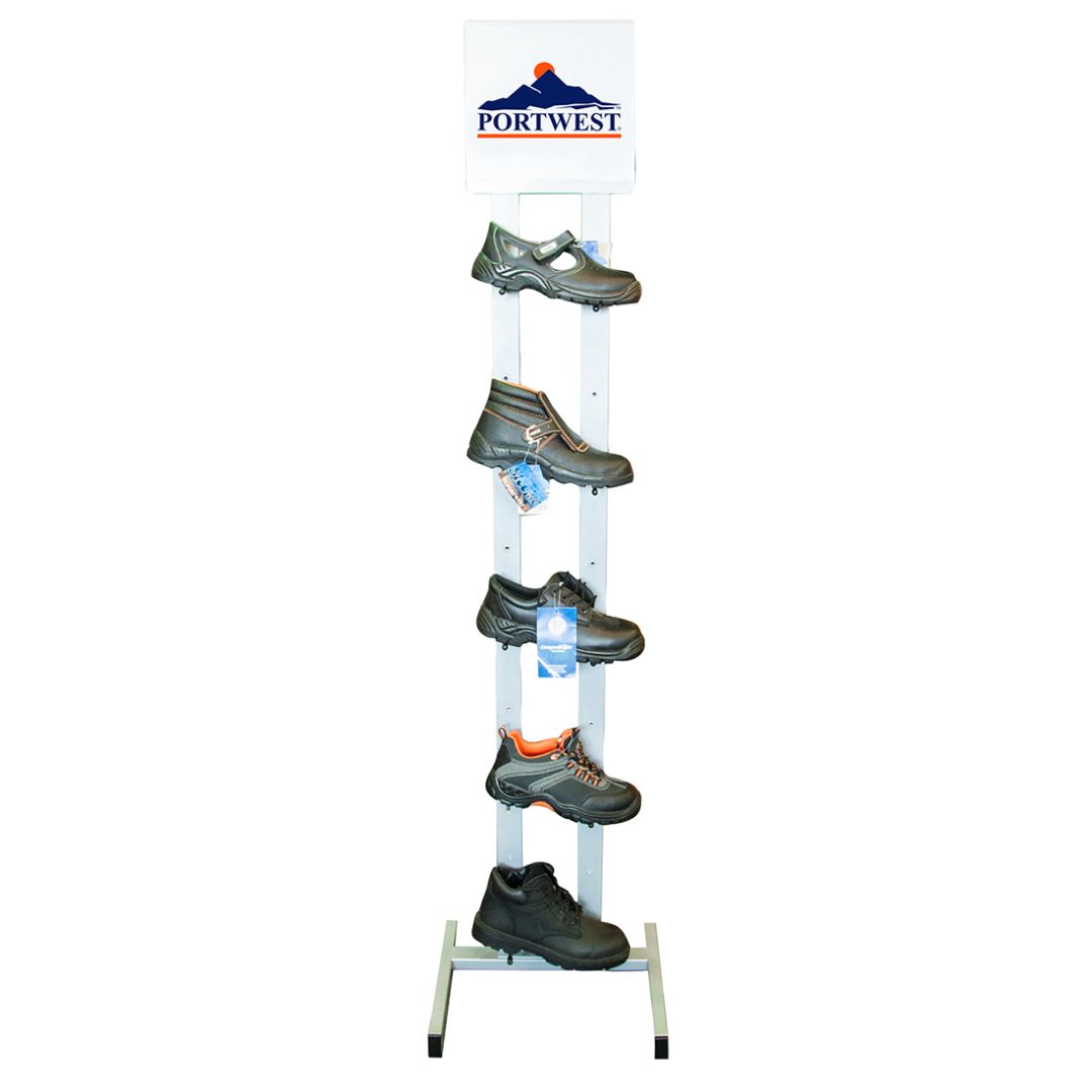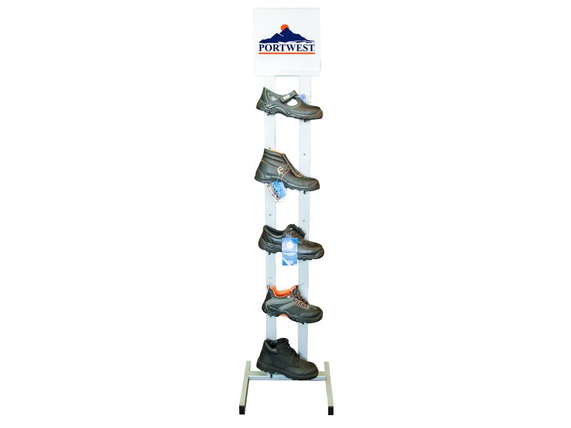 Új fejlesztésű vékony lábbeli állvány. Az öt cserélhető polc különböző magasságban állítható, így lehetővé teszi a cipők, bakancsok és csizmák egy állványot történő bemutatását. Két A4 méretű katalógustartóval készül. 185cm magas x 45cm széles x 40cm mély