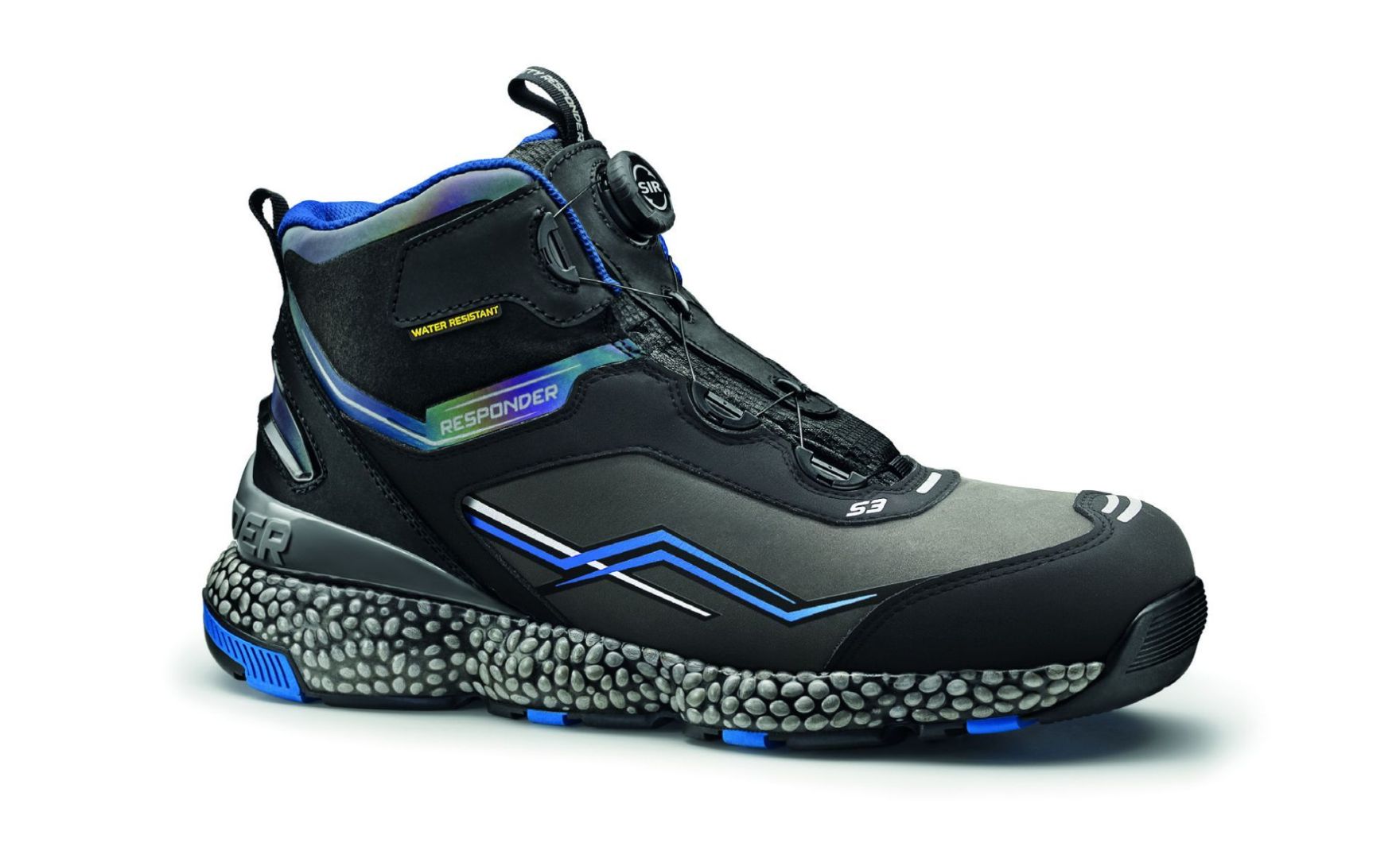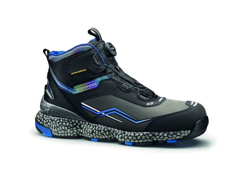 Sir Future termékcsaládhoz tartozó Sir Safety System munkavédelmi bakancs ultradinamikus kialakítással, kompozit orrmerevítővel és középtalppal, vízlepergető nubuk bőr felsőrésszel, "Faster" gyorsfűző rendszerrel és fényvisszaverő betétekkel. A Responder® középtalp átfogja a talpat teljes hosszában és szélességében, rugalmasságot és kifinomult párnázást biztosítva. A mély, hosszirányú barázdákkal ellátott gumi külső talp elősegíti az egész talp rugalmasságát és kiváló tapadást biztosít minden típusú felületen. A sarokstabilizátor megakadályozza a láb kifáradását és javítja a láb stabilitását. A poliészter hálós bélés kiváló vízelvezető képességgel rendelkezik, köszönhetően a szövetnek és a nagy nedvszívó képességű szerkezetnek. A „Faster” gyorsfűzőrendszer lehetővé teszi a tökéletes illeszkedést, egyenletesebbé téve a fűzést és állandó feszültséget az idő múlásával. EN ISO 20345 S3 WR SRC